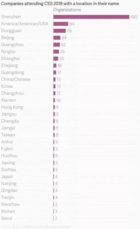 根据主办方美国消费技术协会CTA的数据,大约10%的参展公司(482家),名字中都带有“深圳”字样,“东莞”紧随其后,有78家,再接着是“北京”,有44家。