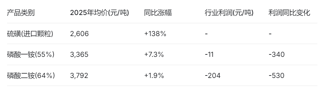 数据表明,硫磺价格上涨幅度远超磷肥产品(磷酸一、二铵)涨幅,成本传导严重不畅。磷肥行业在“保供稳价”政策约束下,难以通过提价完全转移成本压力,全行业陷入普遍亏损状态。