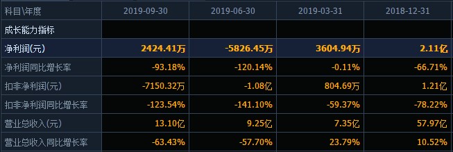 据三季报,2019年前三季度该公司实现营业收入13.1亿元,同比减少63.43%;归属母公司股东净利润0.24亿元,同比减少93.18%;扣除非经常性损益后归母净利润-7150.32万元,同比下降123.54%,业绩可谓惨淡。