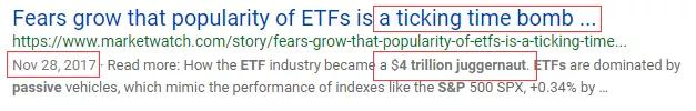 美股的这轮行情,它处于泡沫化行情。美股中的被动型ETF金额庞大,据marketwatch发表于2017年11月的文章,当时美股的被动ETF已有4万亿美元,它是一颗定时炸弹。