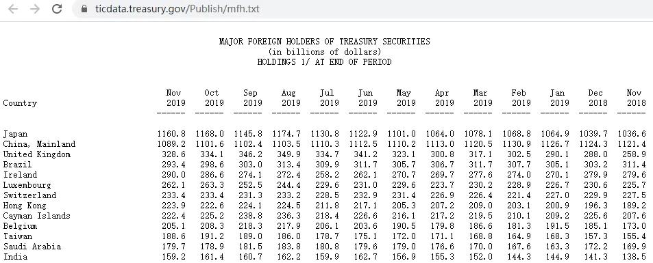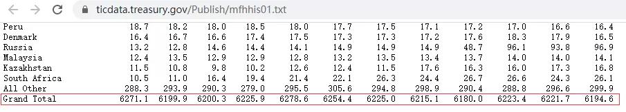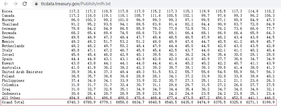 如截图,美国国债各经济体囤的金额变化。Grand Total是总和。