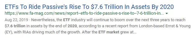 那么到了2020年,被动型ETF在美股的仓位,有多少?据fa-mag发表于2019年8月的文章,位于伦敦的Ernst & Young (EY安永会计师事务所)预期到2020年被动型ETF将在美股有7.6万亿美元。