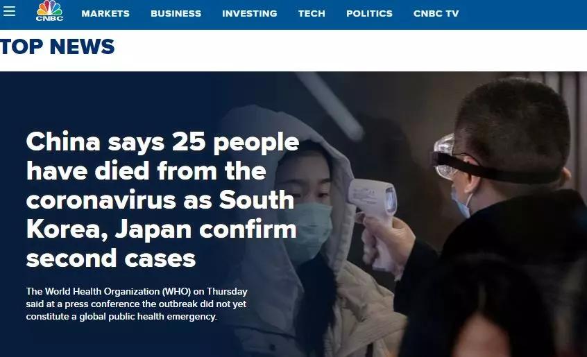 如截图,这是CNBC的头条大新闻:日韩均已确认第二病例。