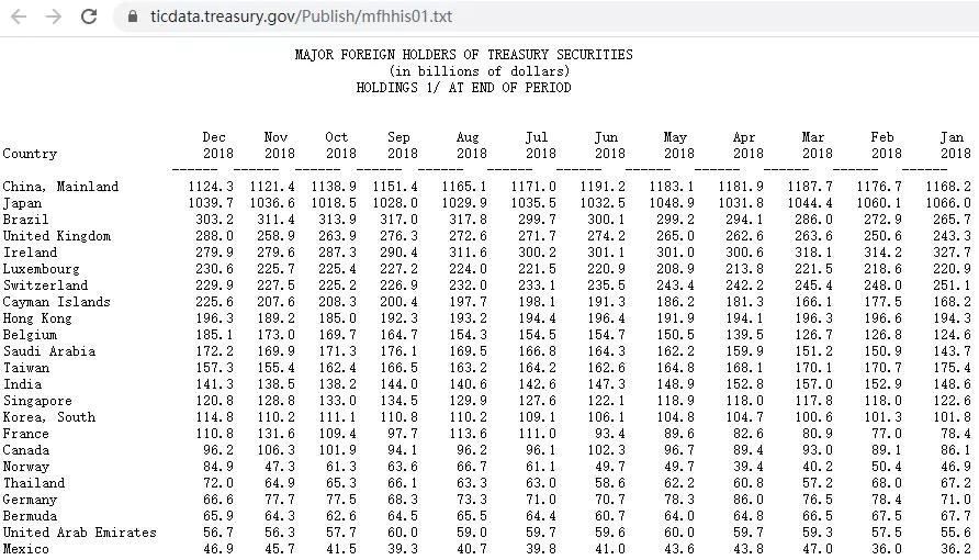 2018年1月(Jan2018),各国囤了6.1946万亿美元美债。