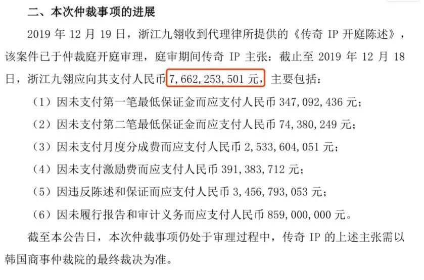 其一,恺英网络控股子公司浙江九翎收到传奇IP株式会社分别在新加坡、韩国发起的两个仲裁案件。