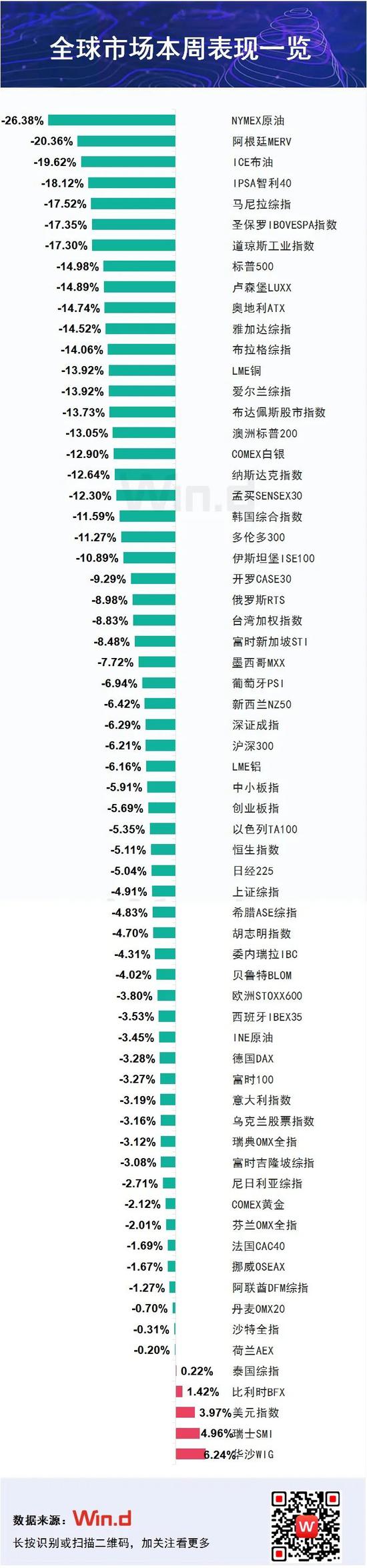 此外,美股本周跌幅也较大,道指跌17.3%,自特朗普2017年上台以来股市成绩全部被抹平;标准普尔500指数本周累计下跌14.98%,纳指跌12.64%,三大股指均创下2008年以来最差单周表现。而国内A股较坚挺,整体波动较小,上证综指、深成指、中小板指累计回落都不到6.5%,处于跌幅榜后列。