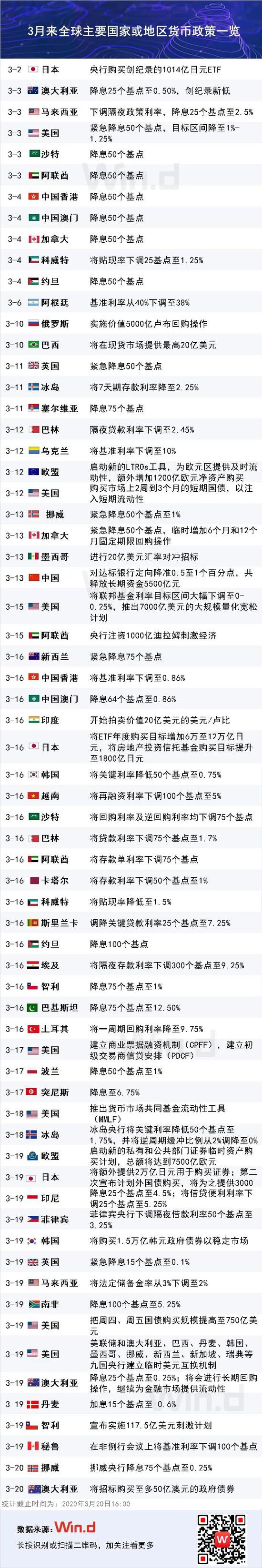 除了美联储各项救市政策外,Wind数据显示,3月以来共有39个国家或地区66次推出重磅政策,而在本周3月15日以来就有31个国家41次推出政策救市,占比总数高达62.12%。其中美国、新西兰、韩国、越南、巴林、阿联酋、卡塔尔、斯里兰卡、智利等多国央行集体降息。此外还有多国央行通过其他操作紧急注入流动性。