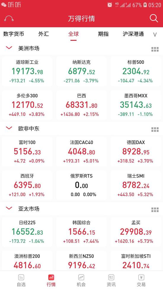 随着海外一系列救市政策出台后,效果逐渐显现。3月19日、20日(本周四、周五)全球多数市场看到了止跌的“曙光”,股市纷纷反弹,商品期货等也触底反攻。欧洲主要市场英、法、德等多国股市反弹,亚洲A股两大股指、中国香港恒生指数、韩国综指等等也都大幅收涨。但美股周五午后却小幅跳水,尾盘加快下挫,最终以道指、纳斯达克、标普500分别下跌4.55%、3.79%和4.34%报收,不过跌幅较前期也小了很多。全球市场最恐慌的时刻或已经过去,但是否能全面开启反攻还要等待时间去检验。