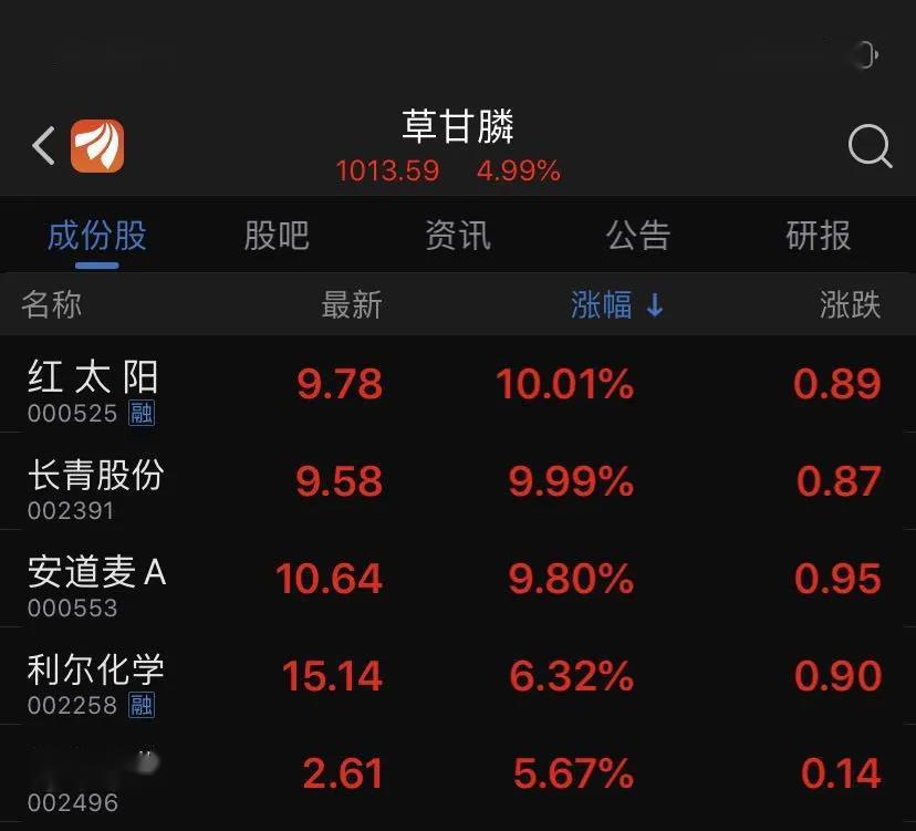 上述消息还刺激了A股农药股在今天(13日)大涨。红太阳、长青股份涨停,安道麦A、利尔化学等个股跟随大涨。