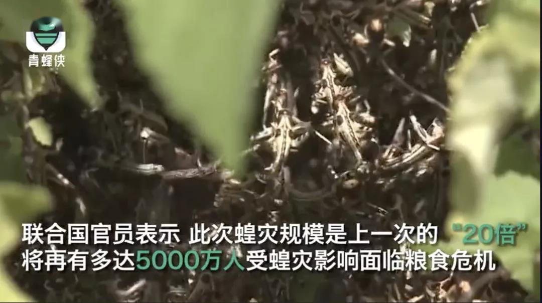 据经济日报,4月9日联合国粮农组织官员表示,新一轮蝗灾的规模大约是今年第一轮蝗灾的20倍。