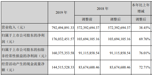 圣邦股份披露的2019年年报显示,公司实现营业收入7.92亿元,比上年同期增长38.45%;实现归属于上市公司股东的净利润1.76亿元,比上年同期增长69.76%;实现归属于上市公司股东的扣除非经常性损益的净利润1.60亿元,比上年同期增长76.01%;实现经营活动产生的现金流量净额1.45亿元,比上年同期增长72.71%。