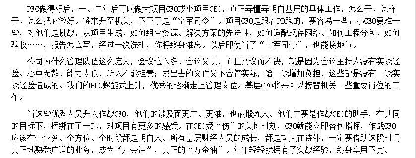 接着,PFC做得好后,可以在一两年后做大项目CFO或小项目CEO,真正搞懂基层的具体工作要怎么做的好,保证将来即使升入机关,也不至于变成空军司令。尤其是小CEO,要接受项目生存、组合资源、解决方案、配适网络、分包验收等等环节的洗礼,从而快速成长。