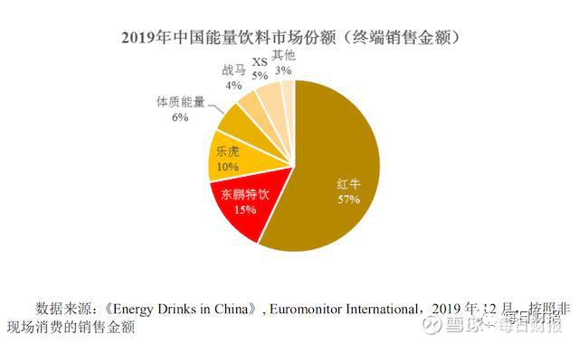 2019年中国能量饮料市场份额排行,红牛、东鹏特饮、乐虎为前三名,分别占据57%、15%和10%。