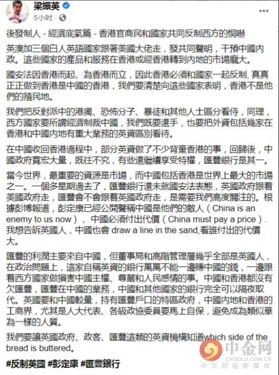 2020 年 5 月 29 日,全国政协副主席、前香港特首梁振英在社交上发文,公开点名汇丰银行: 一个多星期过去了,汇丰银行还未就国安法表态。 他还言辞犀利地指出,汇丰银行这个主要利润来自中国的英资银行不能一边赚中国的钱,一边跟着西方国家做损害中国主权、尊严和人民感情的事。