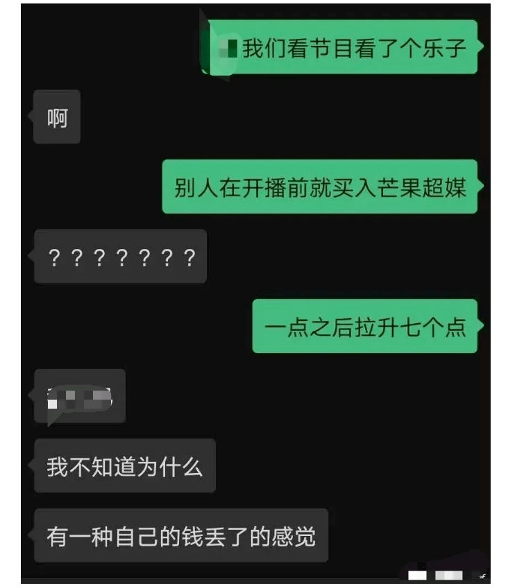 有人花钱买会员,有人花钱买股。“十二点看了半个小时后,我就觉得这个节目一定会爆,所以一点一开始立马买入芒果超媒,一点后迅速拉升7个点”。一位股民如此说道。