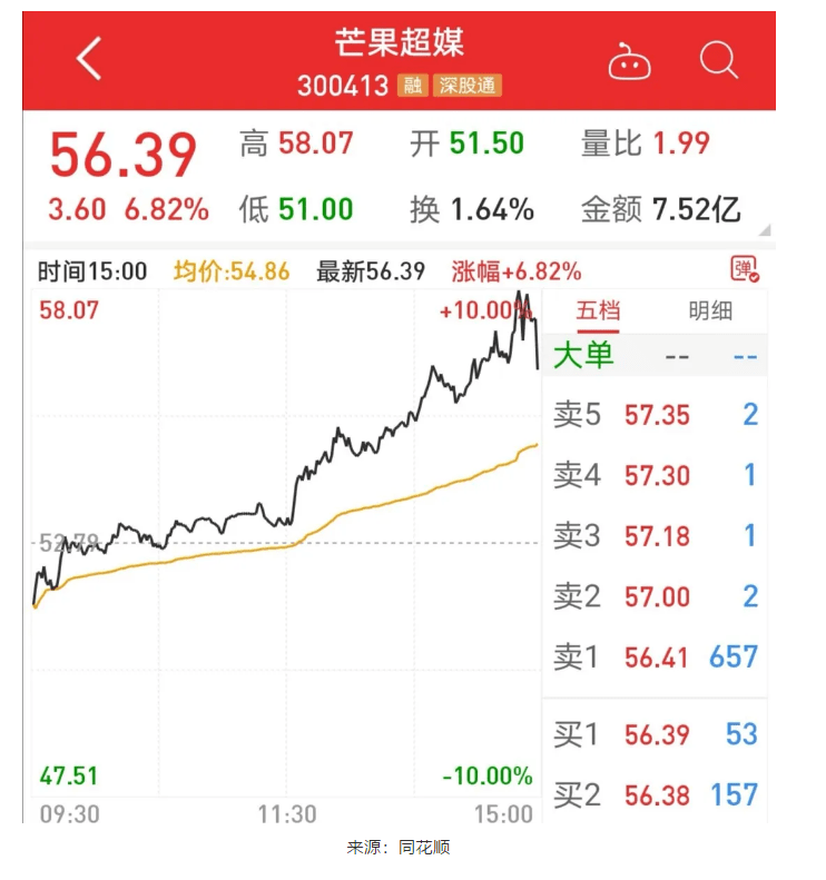 在股民们的齐心协力之下,直接将芒果超媒送上了千亿市值,股价接连大涨。上市公司芒果超媒的股价在12日节目开播首日即涨停,6月14日继续大涨6.82%,6月15日大涨6.51%,收盘价达到60.06元的历史新高,总市值突破1000亿元,创下1069.3亿元的历史新高。