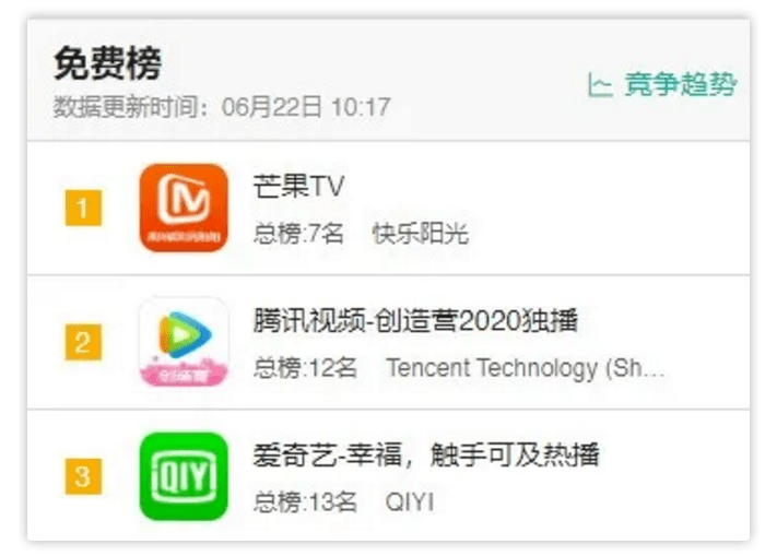 光凭姐姐们的人格魅力,让这档节目在几乎零宣发的情况下,一下子就冲上了排行榜首位。截至6月20日,这档芒果TV出品的综艺已经收获6.7亿播放量,更被寄予年度综艺的厚望,微博话题阅读量也破了110亿。从排行榜来看,芒果TV已经超过腾讯、爱奇艺,位居IOS娱乐类免费榜榜首。