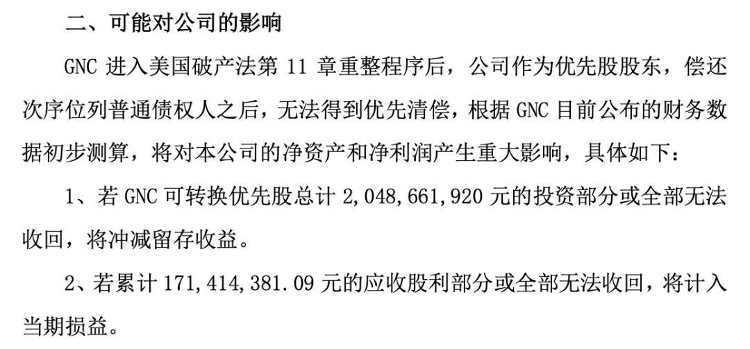 6月24日,哈药集团再发公告称,GNC将破产重整,公司作为优先股股东,偿还次序位列普通债权人之后,无法得到优先清偿。已投资的金额和股利有可能部分或全部无法收回。