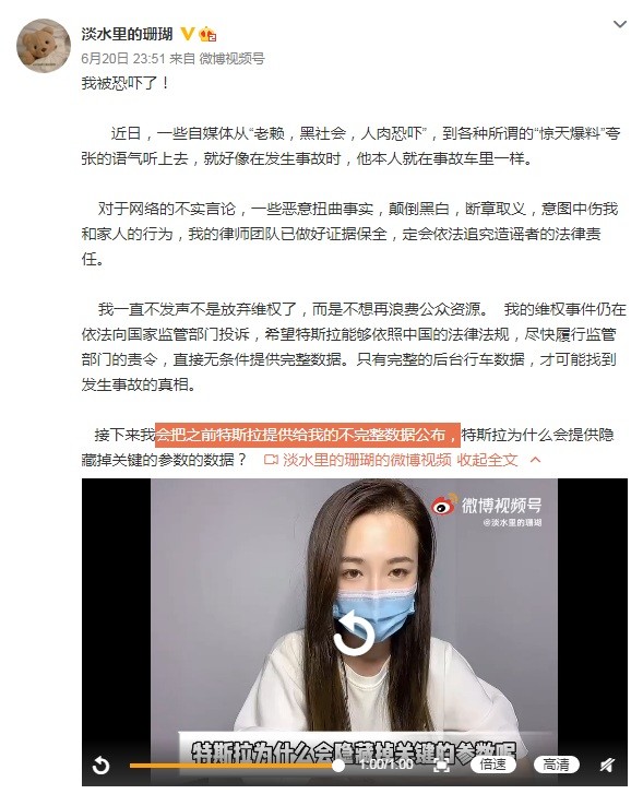 张女士表示,近日遭受到网络攻击和恐吓,律师团队已做好证据保全,定会依法追究造谣者的法律责任。她还敦促特斯拉能够直接无条件提供完整数据。因为只有完整的后台行车数据,才可能找到发生事故的真相。