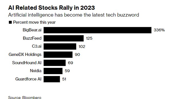 这也不足为其。渴望人工智能的投资者推动AI芯片领军者英伟达(NVDA.US)一跃成为今年大盘股中表现最好的股票,该公司为复杂的人工智能计算任务制造所需的最底层技术——GPU芯片。名称中带有AI的一些相对默默无闻的公司也迅速崛起,比如BigBear. ai Holdings(BBAI.US)年内涨幅超过280%,而 C3.ai(AI.US) 和 BuzzFeed(BZ(21.33,1.18,5.86%)FD.US)涨幅均超过一倍。Guardforce AI(gfai.us)股价上涨约50%。