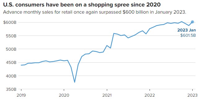 经济学家认为,美国今年有望避免经济衰退的一个原因是,空缺职位和现有员工之间的巨大差距。同时,消费者依然强劲,1月份零售额增长3%,原因是消费者将积累的储蓄用于服务支出,使得餐馆和酒吧人满为患。