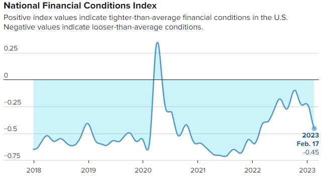 有趣的是,尽管美联储继续收紧政策,但芝加哥联储的一个可以很好衡量经济发展方向的指标自去年10月以来实际上有所下降,这在一定程度上体现了根据实际情况调整政策的挑战。芝加哥联储的全国金融状况指数仍为负值,且呈现下降趋势。(高于零的指标代表紧缩,而低于零的指标代表宽松。)