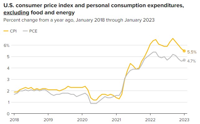 尽管有迹象表明,美国消费者价格指数(CPI)与个人消费支出(PCE)价格指数正在回落,但仍远高于美联储的目标,金融市场越来越担心需要进一步加息,甚至超过决策者的预期。负责制定利率的联邦公开市场委员会(FOMC)最近几个月放缓了加息步伐:从连续四次加息75个基点,到去年12月加息50个基点,再到今年2月初加息25个基点。