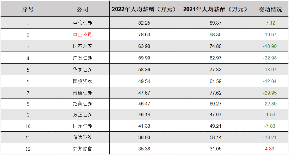 与此同时,其它证券公司也面临不同程度的降薪——海通证券下降29.95万元,广发证券下降22.98万元,招商证券下降22.80万元,中信证券下降7.12万元,但东方财富却是个例外,2022年人均薪酬为35.38万元,较去年上涨了4.33万元。