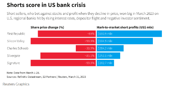 不过,做空者毕竟获得了回报:S3的数据显示,3月份美国区域银行股的整体做空收益达到47.6亿美元,按照134亿美元的平均空头头寸计算,收益率达到35%。