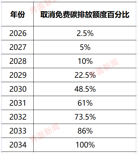 CBAM将从2026-2034年逐步实施,其速度与欧盟排放交易体系中的免费配额逐步取消的速度相同。这一开始时间较去年6月所公布的时间提早了一年。