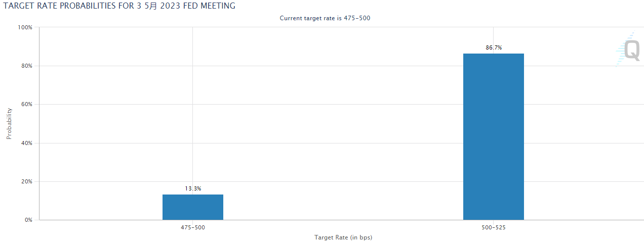 从利率市场的最新定价看,今晚本轮紧缩周期的第十次加息很可能就将如约而至——芝商所的美联储观察工具显示,交易员目前预计美联储在今晚加息25个基点至5%-5.25%的概率高达86.7%,不加息的概率则仅为13.3%。