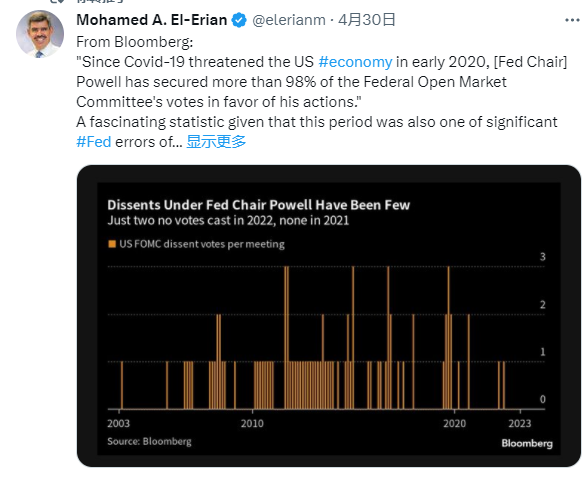 在美联储内部,今年FOMC的票委、芝加哥联储主席Austan Goolsbee上月曾呼吁在评估银行业压力对经济的影响时要“审慎和耐心”,尽管他没有明确表示是否支持5月加息,但一些业内人士猜测若美联储本月加息,他和一些鸽派官员可能会投下反对票。