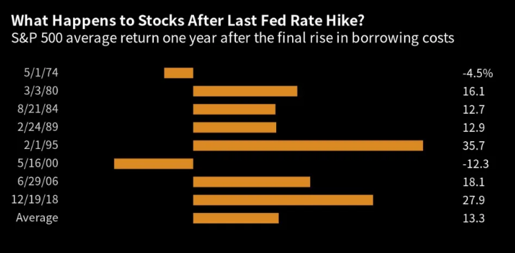 从历史上看,如果今晚美联储的加息,能够被证实是其本轮紧缩周期的最后一次行动,对股市而言显然是相对有利的。根据Strategas Securities的数据,在之前的八个货币紧缩周期中,标普500指数在最后一次加息后一年内平均上涨了13%。