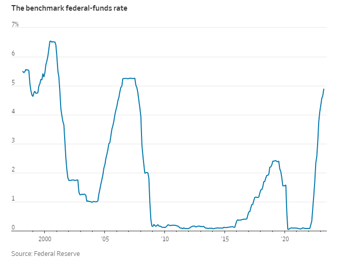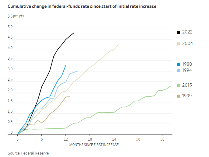 自从去年3月启动加息以试图遏制高通(116.11,0.27,0.23%)胀以来,美联储在过去一年多的时间已经连续9次会议宣布加息,并将联邦基金利率从零利率的低位水平大幅上调至了4.75%-5%的高位区间,创下了逾40年来最快的货币政策收紧速度。