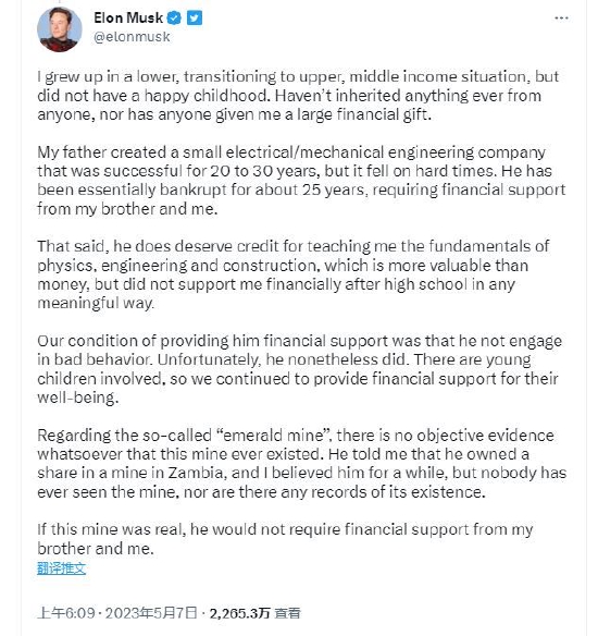 全球第二大富豪埃隆·马斯克发推,再次试图证明自己是完完全全的“白手起家”,分享了童年的简短细节,称自己从未接受过任何遗产继承,甚至没有收到过任何大额的财务礼物,驳斥了有关他不是白手起家,以及他父亲在赞比亚拥有一座翡翠矿的说法。