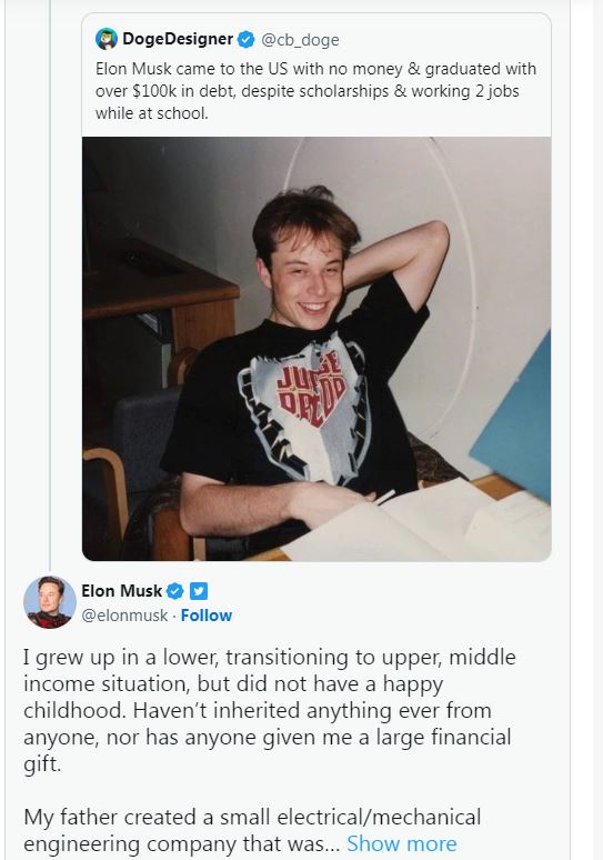一个名为“Dogedesigner”的用户发推称:“埃隆·马斯克来美国时身无分文,毕业时欠下了10万美元的债务,尽管他有奖学金,在校期间打了两份工。”