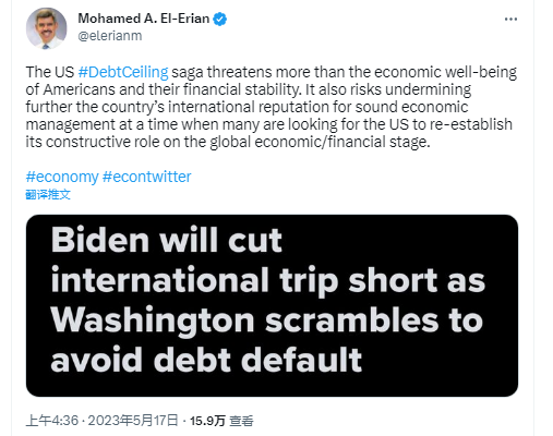近日,众多经济学家已经警告,一旦美国出现债务违约,将带来严重的经济和金融风险,而安联首席经济学家穆罕默德·埃里安(Mohamed El-Erian)也加入了警告的队伍,对此项议题发表看法。