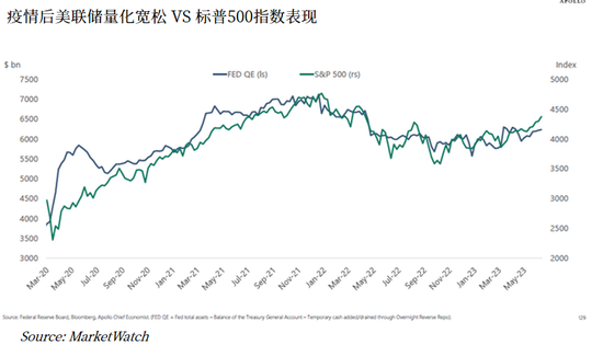 Slok用下图美联储净QE和标普500指数之间的高度相关性来证明了这一点。其中,美联储量化宽松的定义是,美联储的总资产减去美国财政部总账户余额,以及通过隔夜逆回购增加或抽走的临时现金。