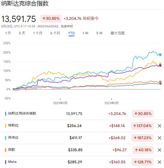 英伟达今年以来飙升近两倍,成为第一家市值超过1万亿美元的芯片制造商。特斯拉(256.24,6.03,2.41%)、Meta Platform今年迄今股价翻番,微软(335.85,1.28,0.38%)股价也上涨了40%左右。另外,以科技股为代表的纳斯达克(13591.7498,36.08,0.27%)综合指数今年以来大涨逾30%。