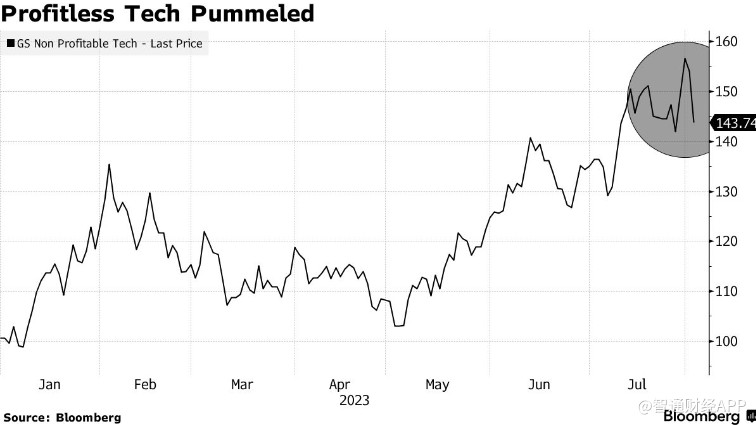 在市场投机较多的领域,抛售更为明显。高盛(351.1,-6.62,-1.85%)跟踪的一篮子不盈利的科技公司股价暴跌7.2%,这是自2022年11月以来的最大跌幅。
