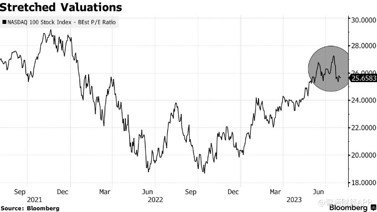 周三的大跌暂时止住了科技股的涨势,此前纳斯达克100指数距离历史高点不到5%。上个月,在人工智能热潮的推动下,纳斯达克100指数的预期市盈率创下了2022年初以来的最高水平。