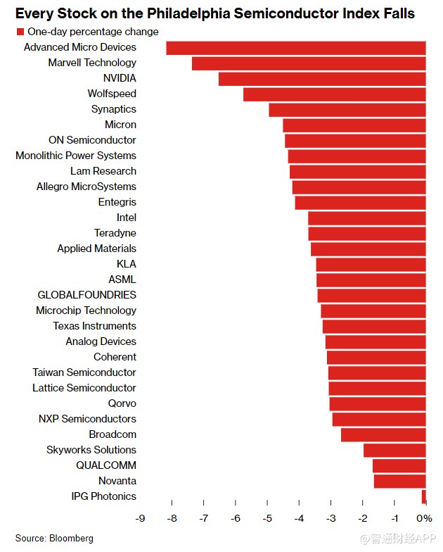 费城半导体指数30只成分股周三全线下跌,AMD(109.35,-8.25,-7.02%)(AMD.US)跌幅居前。