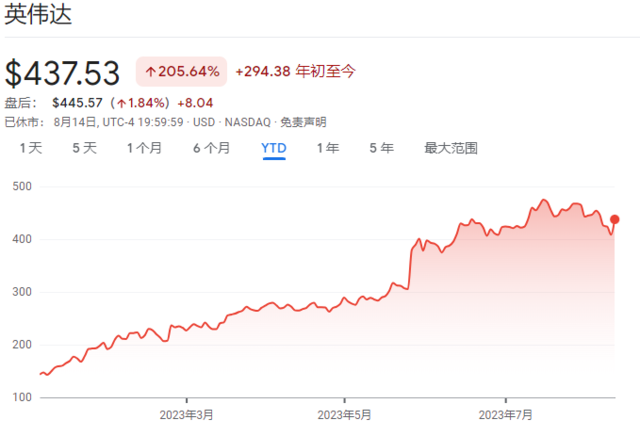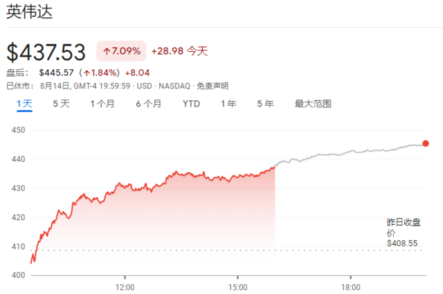 隔夜美股,英伟达股价迎来狂欢,收盘时上涨逾7%,盘后继续上涨1.8%,现报445.57美元/股。
