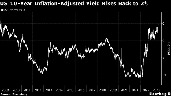 10年期实际或经通胀调整后的收益率已从7月中旬的1.5%左右和今年早些时候略高于1%的水平大幅上升。周一,30年期国债实际收益率上升2个基点,至2.11%。