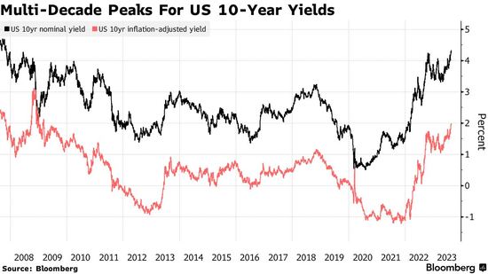 随后,没有通胀保护的10年期美国国债收益率超过了去年10月的峰值,攀升了近10个基点,最高达到4.35%,这是2007年末的水平,之后涨幅略有回落。对政策敏感的两年期国债收益率在纽约尾盘也一度突破5%,再度逼近上月初和今年3月创下的2023年峰值。