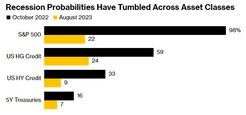 随着华尔街对美国经济陷入衰退可能性的预测降温,市场又开始容易受到美国经济过热迹象的影响——即市场重返“好消息是坏消息”模式。摩根大通(143.83,0.11,0.08%)的数据显示,从高收益债券到股票,表现在金融资产中的经济衰退可能性已降至2022年4月以来的最低水平。这与去年的悲观情绪形成了巨大对比,当时人们实际上将衰退视为板上钉钉的事情。