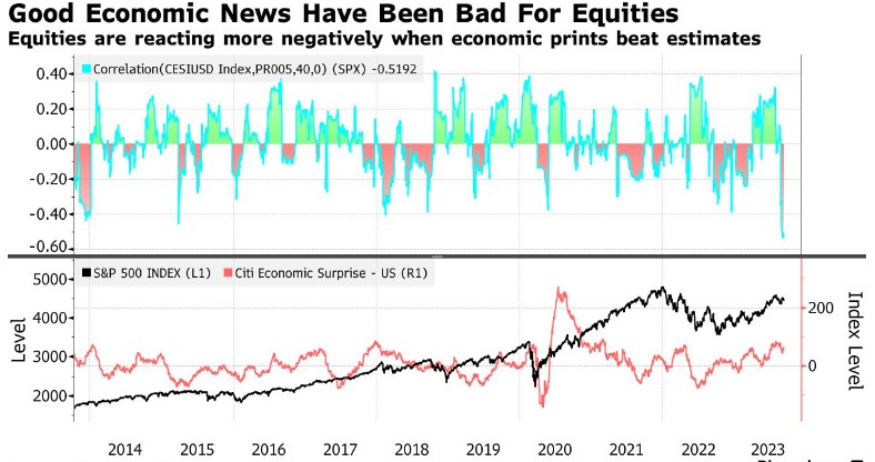 从标普500指数与花旗集团广受关注的美国经济意外指数之间的联系显示出市场对最新经济数据极其敏感。两者的40天相关性已跌至有记录以来最负的水平,这意味着当从就业到制造业的整体数据比经济学家预期的要热时,股市就会下跌。经济数据意外降温会引发故事反弹。