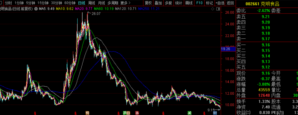今日,在董事长辞职消息公布后,克明食品股价低开低走,收盘,股价单日跌近4%,创2016年以来新低。