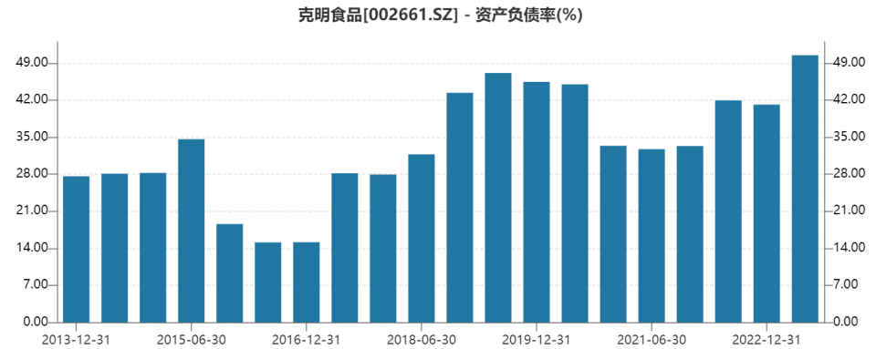 最新半年报数据显示,克明食品的资产负债率已超50%,根据历年半年报及年报数据来看,资产负债率超50%已是公司最高点。较高的资产负债率意味着克明食品的债务压力加大。