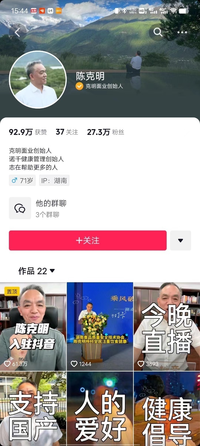 “我叫陈克明,32岁开始做面,60岁公司在深圳挂牌上市,今天发了人生第一条抖音,希望得到您的关注……”,今年7月10日,陈克明在抖音发布了首条视频,宣布正式入驻抖音。